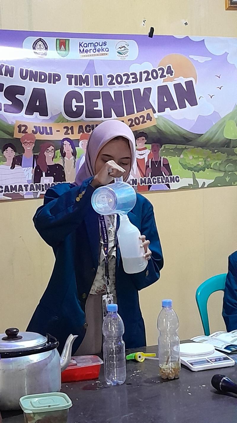 Magelang (05/08/24) – Di Desa Genikan, Kecamatan Ngablak, permasalahan hama pada tanaman masih menjadi tantangan utama bagi para petani. Penggunaan pestisida kimia yang terus-menerus tidak hanya menguras biaya produksi tetapi juga menimbulkan dampak negatif terhadap lingkungan dan kesehatan masyarakat. Oleh karena itu, pengembangan pestisida nabati berbasis bahan alami, seperti ekstrak serai, menjadi alternatif yang menjanjikan untuk mengatasi masalah ini.